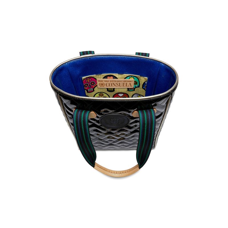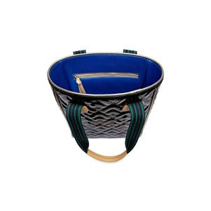 Description: Chica Tote, Inked: For the love of the Classic Tote, and the need for the essentials: the Chica Tote is a smaller version of our alltime favorite Classic Tote. Holding its shape and keeping things light, the Chica is ideal for the everyday haul. Glitter exterior with embroidered detailsEvadney quilted side panels. Comfortable woven straps. Interior open and zipper pocket.
